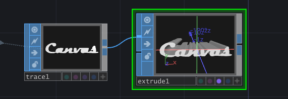 「canvas」の右端のワイヤー接続部をクリックし、ワイヤーを出した状態で、TABキー、オペレーター選択でも同じことが出来ます。これで3D化が完了しました。